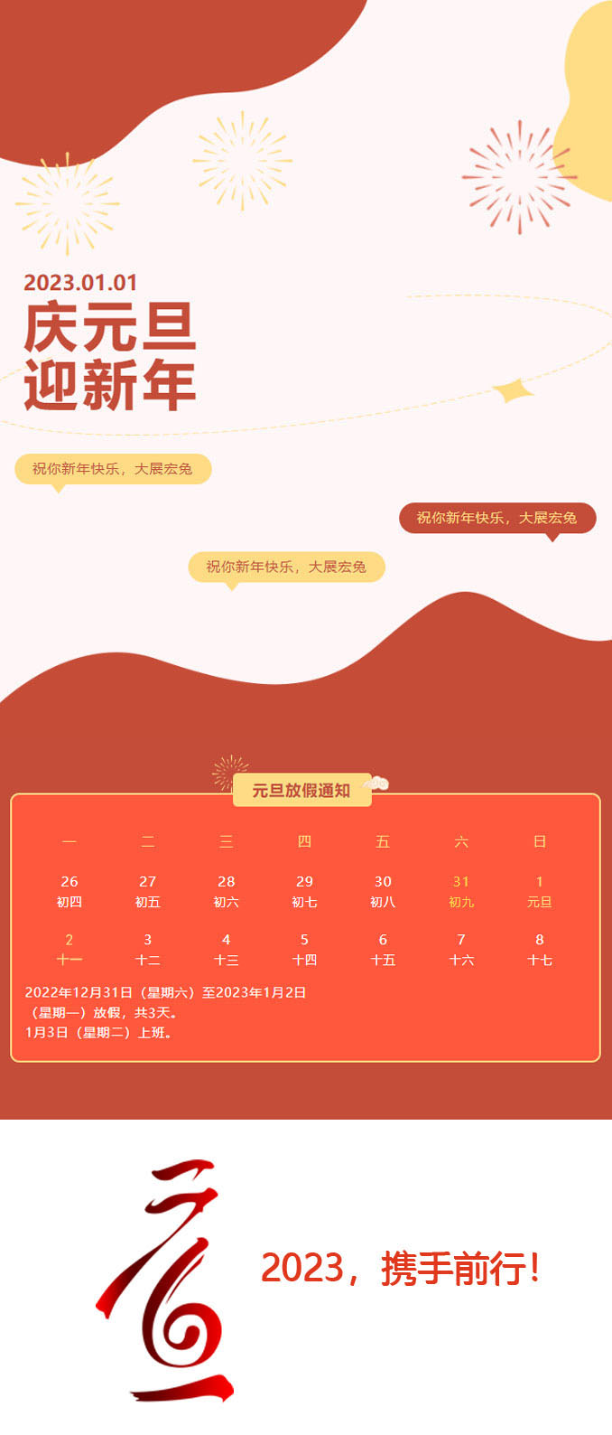 新年礼花绽放,温馨祝福悠长:笑容荡漾脸上,好运罩在身上;平安走在路上,幸福印在心上;事业握在手上,祝福连在线上;开心幸福至上,元旦快乐无上!